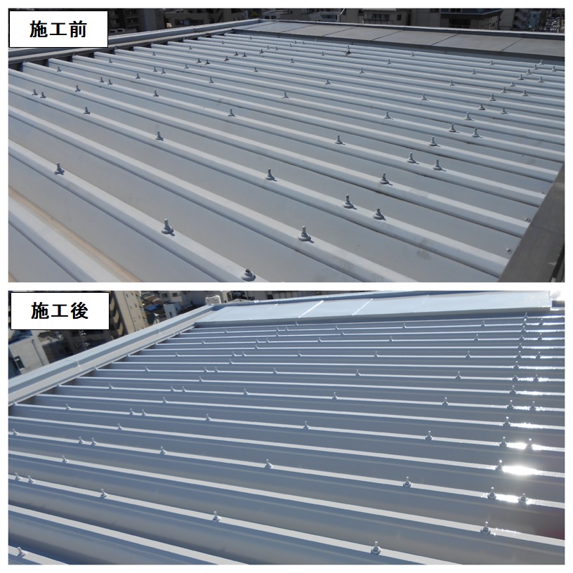 施工詳細 集合住宅(アパート)D 屋根塗装工事 折半屋根の塗替えを行いました。 千葉市中央区 / 工期: 約1週間 / 2015年 折半屋根の塗替えを行いました。 チョーキング現象が起き、丁度いい塗替えの時期に施工しました。 ※チョーキング現象・・・壁や屋根などを手でこすると、白い粉が付く現象。 表層の塗膜が経年劣化で無くなり、顔料が手についている。 耐候性が著しく下がり始めており、塗替えの目安となる。