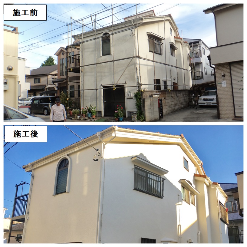 施工詳細 E様邸 外壁改修工事 在来工法の木造2階建て戸建住宅の改修工事を行いました。 足立区 / 工期: 約3週間 / 2015年 2階建戸建て住宅の外壁改修工事を行いました。 木造で在来工法、外壁はラス網にモルタル付け、リシン吹付仕上げでした。 新築時の左官屋の腕が良かったためか、築年数は30年以上ですが、 致命傷なクラックは無かったため、 改修仕様は、ラス網ジョイント部の処理を行い、微弾性フィラーを厚付けし、 水性シリコン系塗料2回塗り仕上げとしました。 なお、屋根は瓦で雨漏りもなく、足場からもクラック等が目視出来なかったため、 改修は行いませんでした。