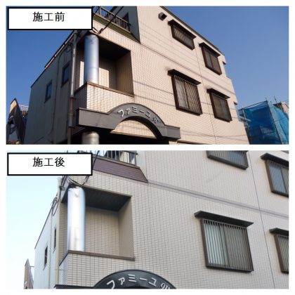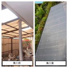 →割れて穴が開き経年劣化が進行していたので、オーナー様にご提案をし、予算内にて張 替えを行いました。 見た目をよくすると、入居率向上もちろんですが、今住んでいる方が綺麗に使うようになると言 われています。 当初、自転車置き場は屋根が割れ、誰のものかわからないゴミが放置されていました。 屋根をきれいにしてからは、自然と自転車が整理して置かれるようになり、ゴミが置かれること もなくなったと、オーナー様にも喜んでいただきました。