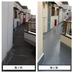 →屋上、外部廊下から建物の中に水漏れがありました。特に廊下では防塵塗装(防 水性はないが、滑り止めにはなる)または防滑シート貼りを行う選択肢もありますが、 ファミーユ91’の場合は床から漏水が発生していたため防水性と予算のバランスのとれた ウレタン塗膜防水とし、珪砂を表面に残るようにすることで防滑性も期待できる仕様と しました。