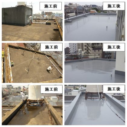 施工詳細 S寮_屋上防水改修工事 3階建て寮の屋上防水とベランダの改修を行いまいました。 墨田区 / 工期: 約3週間 / 2018年 RC造3階建て建物の屋上防水改修工事を行いました。 施工前では雨漏りが発生。 全面をウレタン塗膜防水X-1工法にて防水。 雨漏りは止まりました。 平面の既存押さえコンクリートのひび割れが酷く、 新築時の防水も長い年月で相当傷んでおり、 複数のひび割れ箇所から雨水が侵入していた様子でした。 また、屋上で洗濯物を干していたようなので、滑らないよう 珪砂をまぜて、ノンスリップ仕様としました。