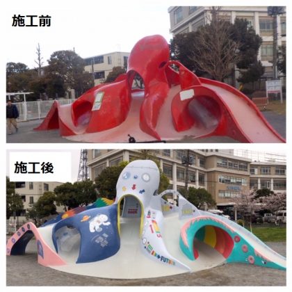 足立区の魅力ある公園づくり「パークイノベーション」事業の一環で、タコすべり台の塗り替え工事を行いました。