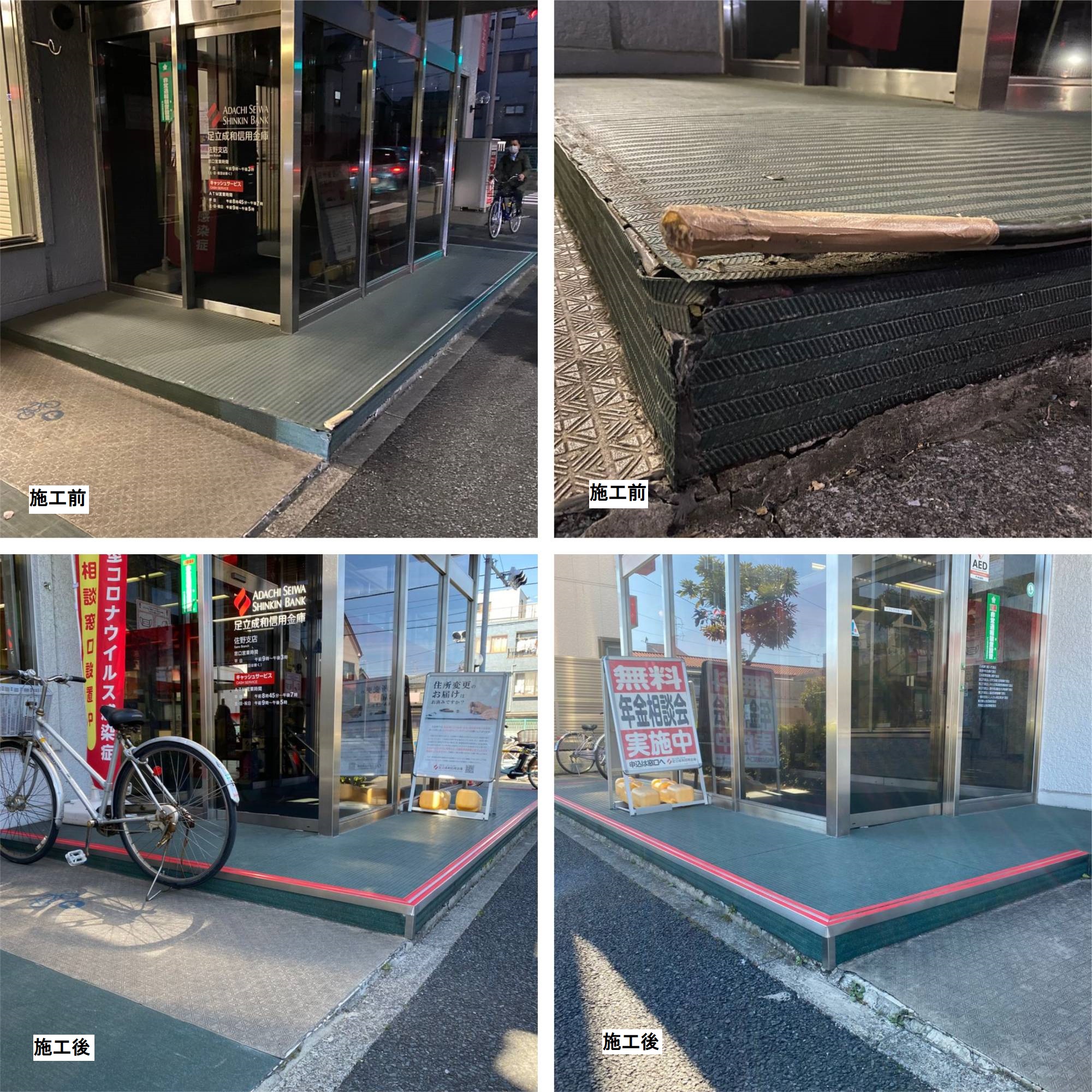 施工詳細 ”段差” 分かりやすく ノンスリップ交換工事を行いました。 足立区 / 工期: 2日 / 2022年 足立成和信用金庫さま 佐野支店にて ・階段や段差の端部(段鼻といいます)の注意喚起及び転倒防止 ・繰返しの使用による段鼻の欠損防止(カドは欠け易いんです) ・凸凹加工やゴム素材による滑り止め効果 を目的として、ノンスリップの交換を行いました。 利用者の少ない時間を狙っての作業となりました。