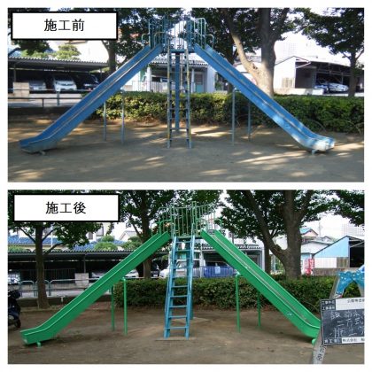 上段施工前写真は青が褪せているだけでなく、滑り台の裏側等は錆びも発生していました。錆を落として塗り替えたのが下段です。