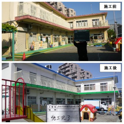 施工詳細 西新井保育園外装改修工事 施工前は、写真では分かりませんが、外壁にひび割れ等が発生していました。施工内容紹介の外壁下地補修の工程を行い、写真の通り、足立区カラーの配色での塗装仕上げとなりました。 足立区 / 工期: 約2ヵ月 / 2014年 RC造2階建て保育園の大規模修繕工事を行いました。 施工内容は、 ・屋上防水 ・外壁下地補修 ・外壁塗装 ・シーリング工事 登下園の時間を考慮し、搬出入作業等をおこなう等、園の先生と密に連絡を取合い、進めていきました。