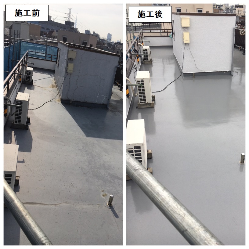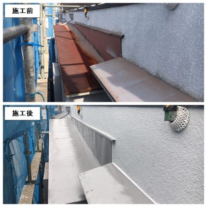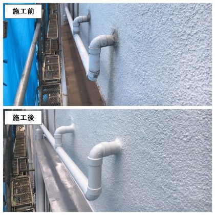 施工詳細 C様邸(ビル) 外装改修工事 上段の施工前では、雨漏りも発生し、庇などの鉄部も錆びがひどく発生していました。下段では錆を落とし、発錆を少しでも遅らせるよう錆止めを塗布し、グレーで仕上げました。 荒川区 / 工期: 約3週間 / 2018年 オーナー様の自宅兼ビルであり、 S造・モルタル壁3階建て建物の外装改修工事を行いました。 外壁からは雨漏りも発生していましたが、全面を下地より改修し、雨漏りもストップできました。 屋上防水に関しては、既存ウレタン塗膜防水の劣化がそれほど進行していなかったため、 トップコートの塗替えのみを行いました。